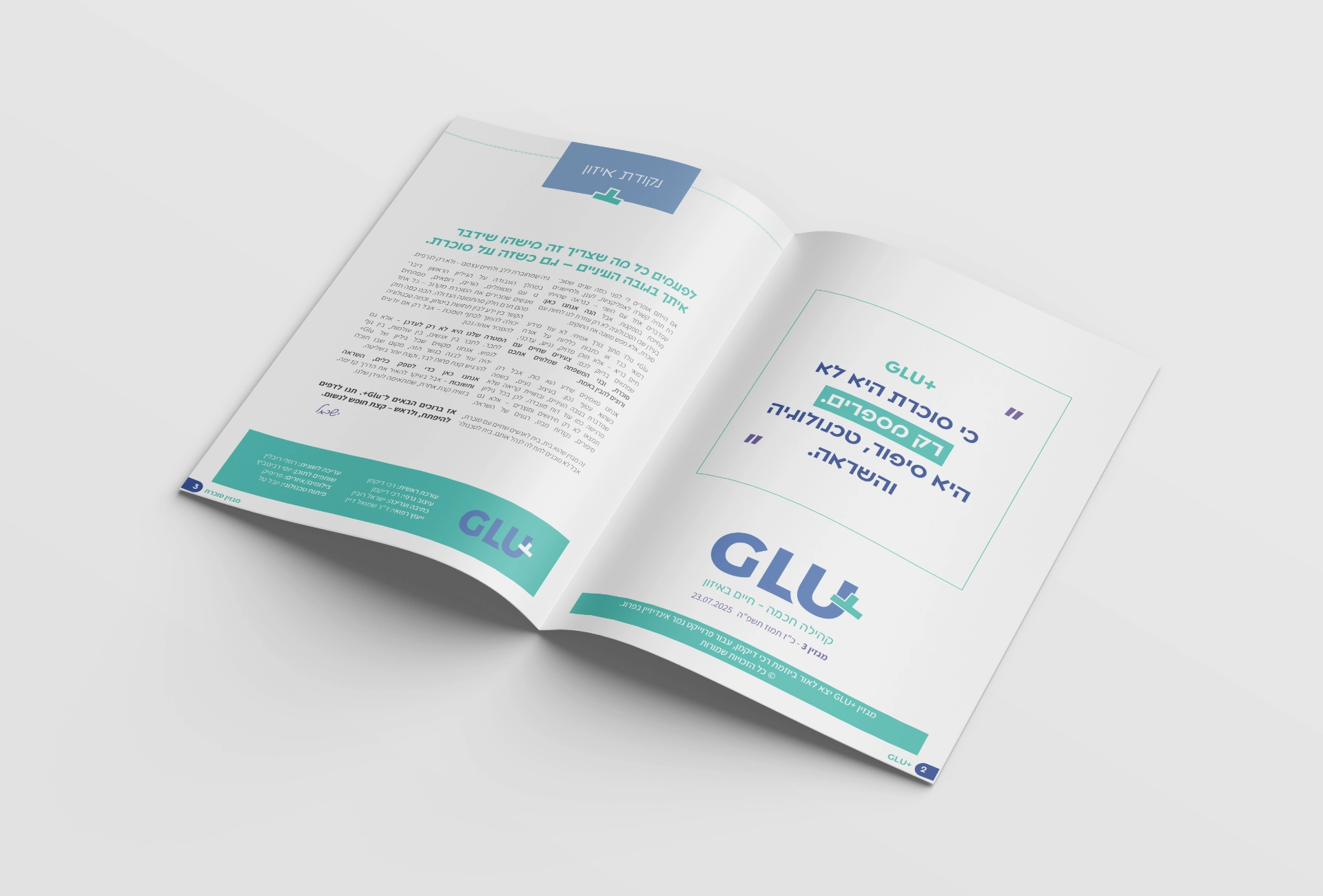 המגזין שמחבר בין סוכרת, טכנולוגיה וצעירים, בעיצוב מינימליסטי ומדויק. Glu+ מביא תוכן רפואי וטכנולוגי בשפה צעירה, עיצוב וחוויית קריאה חדשנית. מדבר לצעירים שחיים עם סוכרת ומבין אותם באמת, כתבות קלילות ומעמיקות, מדריכים על לולאות סגורות, חידושים טכנולוגיים ומתכונים מותאמים.